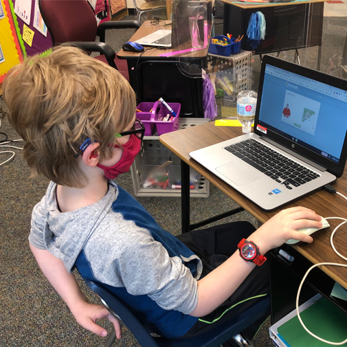 Student sitting at a small table wearing glasses, a hearing aid, a face mask, and a wrist watch using a computer.